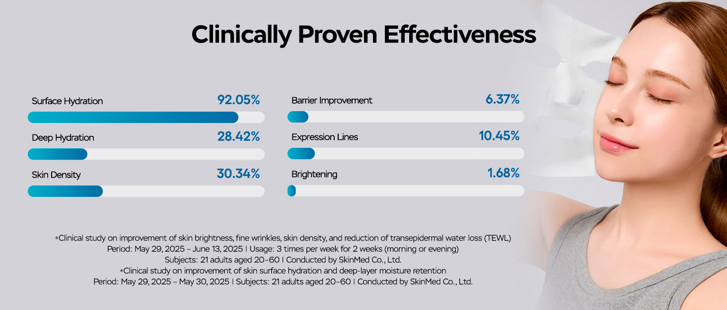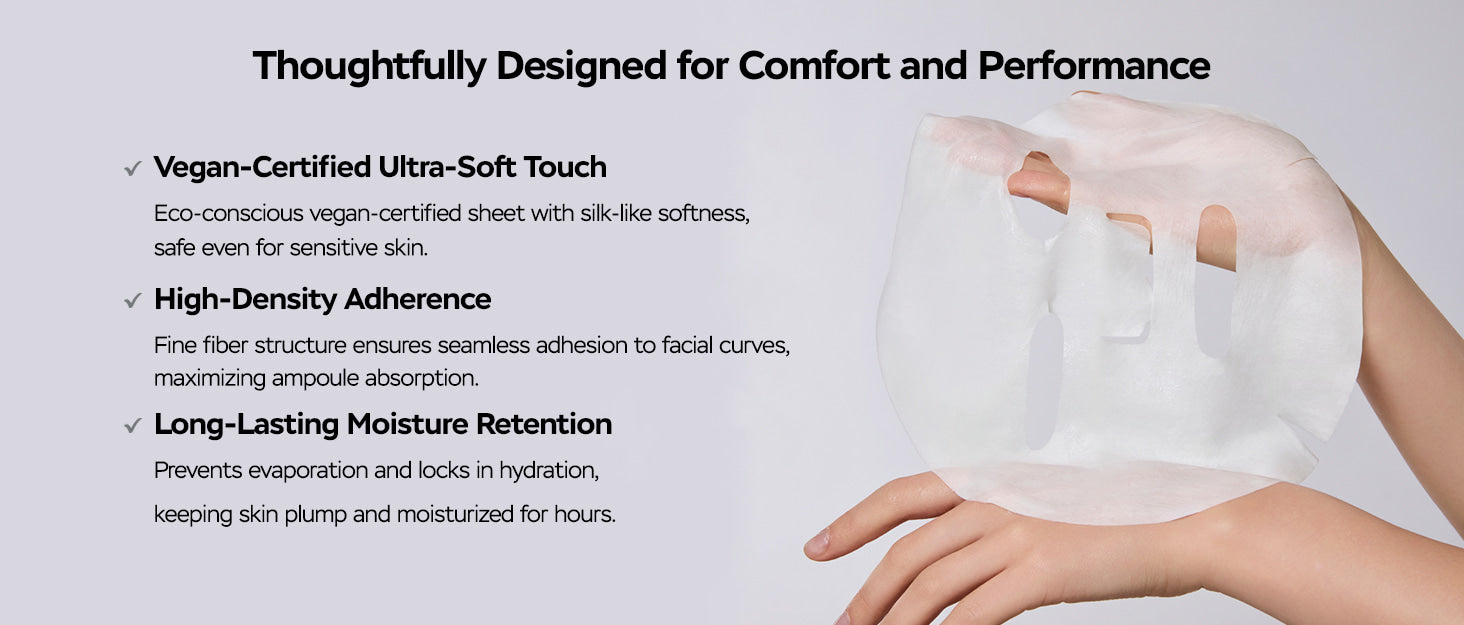 This high-performance mask is designed for visible anti-aging benefits: in a clinical study, the mask helped improve the look of skin elasticity, bounce, and the appearance of expression lines after just two weeks of use. For a smoother, more radiant complexion, the formula is enriched with Niacinamide and Panthenol, promoting brightness and refining texture. Use this richly soaked sheet mask for intensive hydration and a lifted, supple finish that improves overall skin structure and visible expression lines.