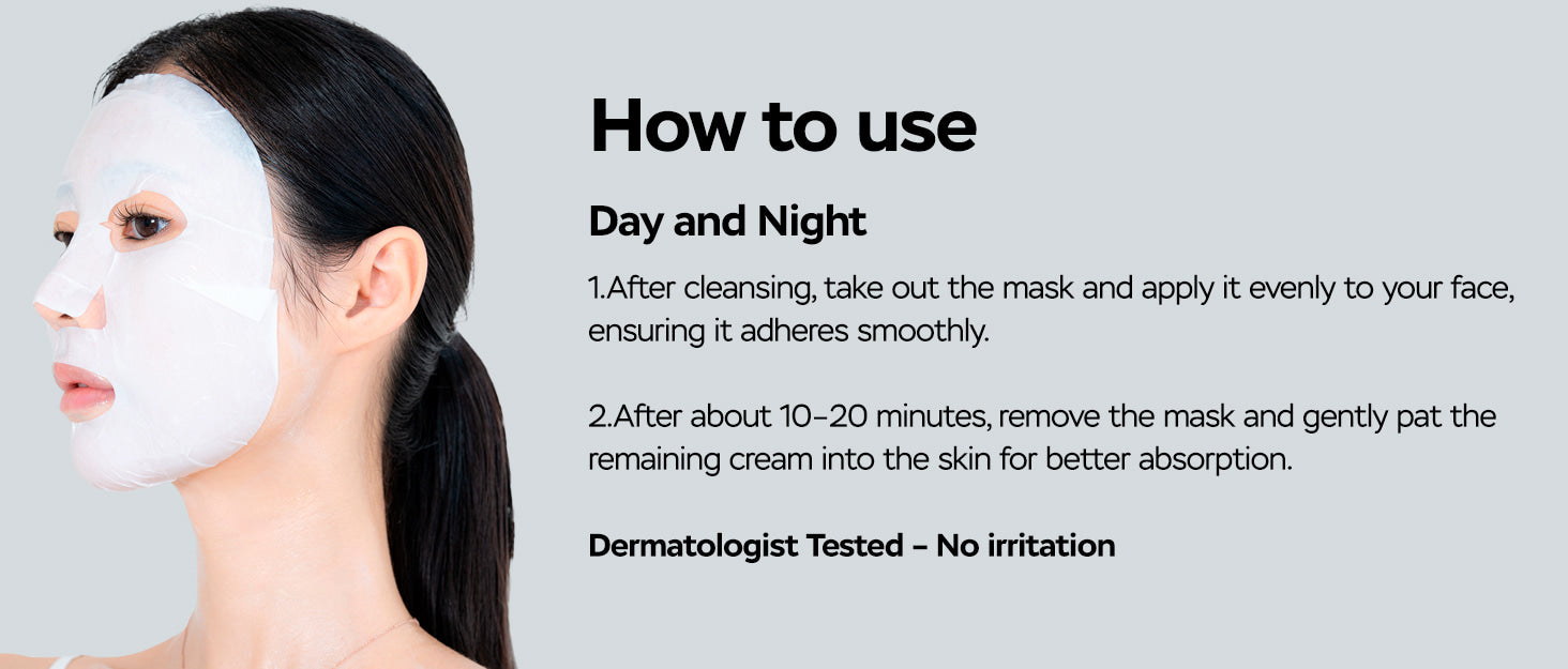 Use these masks day or night after cleansing: Apply the mask evenly to your face for 10-20 minutes, then remove it and gently pat the remaining cream into the skin until fully absorbed.