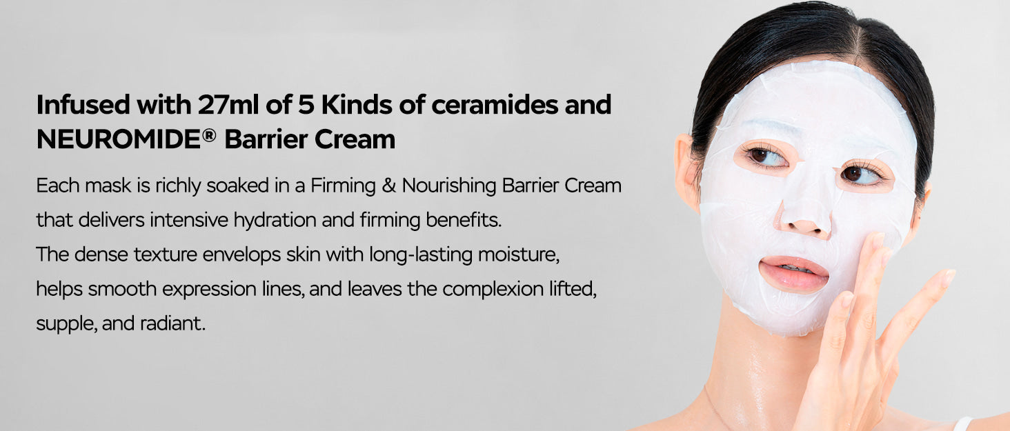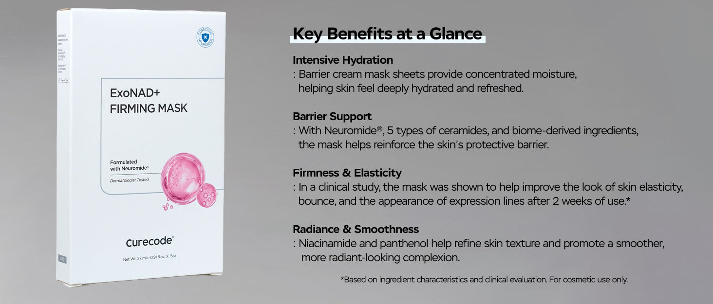 Experience next-level skin renewal with the Curecode ExNAD+ Firming Masks, an innovative cream-type treatment clinically evaluated to address key signs of aging, including expression lines, elasticity, and density. Powered by the proprietary ExoNAD+ blend, which features Phytocelltec Goji and NAD+ for vital skin support, alongside Neuromide and 5 types of Ceramides, these masks work to intensely reinforce a compromised skin barrier and provide concentrated, long-lasting moisture. The rich barrier cream essence instantly leaves the complexion feeling deeply hydrated, plump, and enveloped in a supportive layer of nourishment.